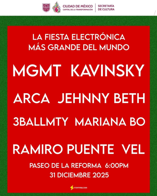 La jefa de gobierno de la CDMX, Clara Brugada, organizó este evento gratuito en la Ciudad de México, que estará encabezado por artistas como MGMT, DJ Set, Arca y Kavinsky. Con este anuncio se espera que se superen los 200 mil asistentes, un espectáculo con luces láser y un sonido potente.
